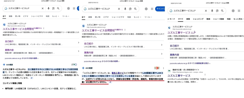 毎朝確認の為に「ユズル工事サービスLLP」「ユズル工事サービス」をchromeで検索しています。AI概要で「公式サイトが見られない」の説明です。困ります!!!今後改善されれば良いのですが心配です。仕事の依頼はキーワード検索からなので問題ありませんが、次はどんな表示がでるのでしょうか?朝令暮改。良くなって嬉しいです。画像も早速入れ替えました。ブログは操作が簡単で助かります!